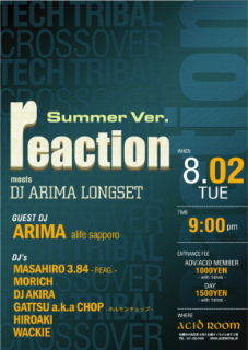 2011.08.02.TUE reaction summer! meets DJ ARIMA LONGSET @ACIDROOM いよいよ夏らしくなってきましたが、北海道はあっという間の夏だし、たくさん楽しみましょう!! 2011年夏のreactionは、DJ活動20周年を迎え、札幌のDISCO・CLUBサウンドの歴史を知るプロフェッショナルDJ、sapporo alifeのチーフDJ ARIMAがゲストイン! alifeの毎年恒例イベントである『有間記念』では、かなり気合いの入った本気のロングセットでフロアを沸騰させ、毎回数百のオーディエンスが彼の巧みなプレイに汗だくになりながら陶酔乱舞している。 今