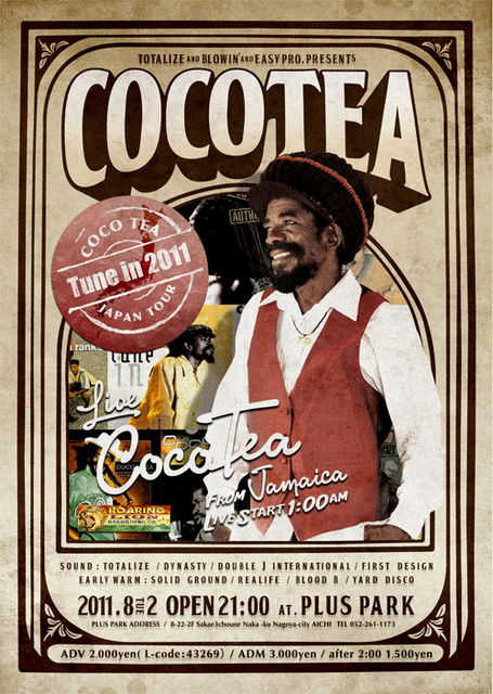 管理人様、告知失礼致します。 8/2(火)COCO TEA JAPAN TOUR Tune In 2011 TOTALIZE+Blowin'+EASY PRO. PRESENTS OPEN 21:00 -REGGAE- 【Live】※Live Start : 1:00 COCO TEA from Jamaica 【SOUND】 TOTALIZE / DYNASTY / DOUBLE J INTERNATIONAL / FIRST DESIGN 【EARLY WARM】 SOLID GROUND / REALIFE / BLOOD B / YARD DISCO ◆Entrance System◆ ADM 3,000yen ADV 2,000yen ( L-code : 43269 ) AFTER 2:00 1,500yen ====サービスのご案内==Service Information==== ※女性専用FREE コインロッカー有り 先