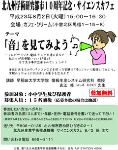 平成23年8月2日(火) 15:00〜16:30 [会場] cream(小倉北区馬借1-15-8) サイエンスカフェ (Science Café) は、カフェのような雰囲気の中で科学を語り合う場としてイギリスやフランスで始まり、日本でも各地で行われています。 [講師] 早稲田大学大学院 情報生産システム研究科 [教授] 吉江 修(よしえ おさむ)先生 おはなしのテーマ 〜テレビやラジオ、電話、そして友達の声など、私たちが日頃聞いている「音」を目で見る事は出来るのでしょうか?身近にあるものや、パソコンなどを使った実験で「音」について勉強してみよう