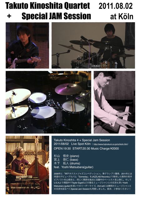 私の地元関西から若手有名ミュージシャンを招いてリーダーライブを行いますので告知させていただきます。2ndset には地元静岡のミュージシャンと交流を図るべく、jam sessionを用意いたしました!ミュージシャン同士の人脈を広げるもよし。伴奏を頼むのもよし。飲んで語り合うのもよし。是非交流を深めてレベルアップの糧にしていただきたいと思います。是非是非ご参加ください!イケメンばかりですヨ!
