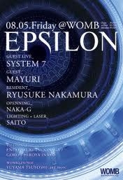 8/5(fri) EPSILON@womb feat.SYSTEM 7 GUEST LIVE: SYSTEM 7 GUEST: MAYURI RESIDENT: RYUSUKE NAKAMURA OPENING: NAKA-G VJ: SAKOTA HARUKA RESIDENT: SAITO VIP LOUNGE: ENDO, YUKI TSUKINAGA, GORO, HIROYA INAKO WOMB LOUNGE: YUYAMA TSUYOSHI AND MORE OPEN : 23:00 | DOOR : \4,000 W/F \3,500 MEMBER : \3,000 WEB SITE : http://www.myspace.com/ryusukenakamura/ ★先着100名さまにDVD『 System7 - Positive Noise PV directed by Mood Masic 』をプレゼント!! MUSIC CATEGORIES : TECHNO System 7は