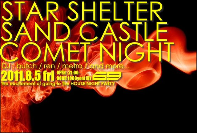 STAR SHELTER + SAND CASTLE + COMET NIGHT 2k11.8.5 @LUZ69 OPEN 21:00- DOOR 1000yen(1D) DJ : butch / ren / metro / ....and more ☆LUZ69 HOUSE ELECTRO 4っ打ちPARTYの豪華トリプルネームPARTYです♪ 皆さんお待ちしております!