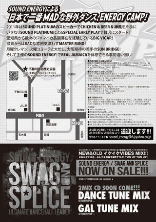 告知失礼します!! SOUND ENERGY PRESENTS 野外ダンス = ENERGY CAMP 2011 = 今年もやってきました! 日本で一番MADな野外ダンス、ENERGY CAMP!! 今年、2011年はSOUND PLATINUMのスピーカーでCHICKEN & BEER & 神風を片手に いきなりSOUND PLATINUMによるSPECIAL EARLY PLAYで贅沢にスタート! 愛知県から数々のジャマイカ長期滞在を経験しているBIG VIGAR! 滋賀からBADな雰囲気漂わすMASTER MIND! 月曜クレマン、火曜コヨーテと大忙し、大阪期待の若手、SUN BRIDGE! そして主催のSOUND ENERGY! でREAL JAMAICA