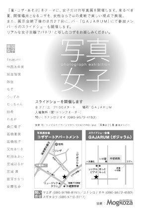 ¢¨´ÉÍý¿ÍÍÍ¡¢µ®½Å¤Ê¥¹¥Ú¡¼¥¹¤ò¤ª¼Ú¤ê¤·¤Æ¹ðÃΤµ¤»¤ÆÄº¤¤Þ¤¹¡£ ²Æì¤Ë½»¤àÉáÄ̤ν÷¤Î»Òã¤Ë¤è¤ë¥¢¥Þ¥Á¥å¥¢¼Ì¿¿Å¸¡£ ¡Ú¼Ì¿¿½÷»Ò¡Û ¡Ö²Æ¡¦¥³¥¶¡¦¤¢¤½¤Ö¡×¤ò¥Æ¡¼¥Þ¤Ë¡¢½÷»Ò¤À¤±¤Î¼Ì¿¿Å¸¤ò³«ºÅ¤·¤Þ¤¹¡£Íè¤ë¤Ù¤²Æ¡¢³«ºÅ¾ì½ê¤È¤Ê¤ë¥³¥¶¤ò¡¢½÷À¤Ê¤é¤Ç¤Ï¤Î½ÀÆð¤Ç³Ú¤·¤¤»ëÀþ¤Çɽ¸½¡£ ¤Þ¤¿¡¢Å¸¼¨²ñ½ªÎ»¸å¤Î8·î27Æü¡ÊÅڡˤˡ¢¥Ð¡¼¡ÚGAJARUM¡Û¤Ë¤Æ»²²Ã¥á¥ó¥Ð¡¼¤é¤Î¥¹¥é¥¤¥É¥·¥ç¡¼¤â³«ºÅ¤·¤Þ¤¹¡£ ¥ê¥¢¥ë¤Ê½÷»ÒÌÜÀþ¤Ç¥Ñ¥Á¥ê¡ª¤È¼Ì¤·¤¿¥³¥¶¤ò¤ª³Ú¤·¤ß¤¯¤À¤µ¤¤¡£ ¢£»²²Ã½÷»Ò Tsugumi¡¢ÃçÀ¾¤¢¤æ¤ß¡¢ÃÎǰÃÒÈþ¡¢Ìï²Â¡¢¤à¤Ã¤Á¤ã¤ó¡¢Í³´õ¡¢¤ï¤¢¤«