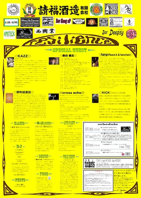 ¤³¤ÎÅÙ¡¢²Æì¸©Æâ£´¥ö½ê¤Ç²»³Ú¤ä¥À¥ó¥¹¡¢À÷¤áʪ¤Ê¤É¤Î¥¢¡¼¥Æ¥£¥¹¥È¤È¥¤¥Ù¥ó¥È¤ò³«ºÅÃפ·¤Þ¤¹¡£ resilience@ÀгÀÅç£Â£á£ò £Ò£Ù£Õ 8/6 21:00¡Á3:00 resilience@ÃÝÉÙÄ®Æâ¤Î̵¿ÍÅç8/7 ¥Á¥±¥Ã¥ÈÁ°Çä¤ê¤Î¤¿¤á¡¢Á°Æü¤Þ¤Ç¤Ëresilience@LIVE.jp¤Ë¤´Ï¢Íí¤¯¤À¤µ¤¤¤Þ¤»¡£ resilience@ÀгÀÅç£Â£á£ò £Ä£å£å£ð£ó£ù 8/9 21:00¡Á3:00 resilience@²ÆìËÜÅç£Ì£Ï£Ö£Å£Â£Á£Ì£Ì 8/12 22:00¡ÁLAST ½Ð±é¼Ô¤Ï ·¬ÅÄ·ò»Ö ¥¯¥é¥·¥Ã¥¯¥¹¥¿¥¤¥ë¥·¥ó¥¬¡¼ ÂÆ§¤ß¥ª¥ë¥¬¥ó¤ä¥Ô¥¢¥Î¡¢¥®¥¿¡¼¤ò»È¤¦Â¾¤Ç¤Ïݤ±¤Ê¤¤²Î