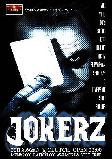 ¤¤¤è¤¤¤èº£½µÅÚÍËÆü¤Ç¤¹¡ª ¡ÚJOKERZ¡Û 2011.8.6(sat) @CLUB CLUTCH OPEN 22:00-5:00 ÃËÀ ¡ï2,000 ½÷À ¡ï1,000 (Ë¢À¹¡¢¥½¥Õ¥È¥É¥ê¥ó¥¯FREE) ¡ÈÀèÃå30̾Íͤ˥³¥ó¥ÔCD¤ò¥×¥ì¥¼¥ó¥È¡É ¡ÚVDJ¡Û VATO ¡ÚDJ's¡Û SUNAO KEITA M-LION NICITY PLAYYAÀç¿Í SANPLAZA P ¡ÚLIVE PAINT¡Û SAKU RASUKA