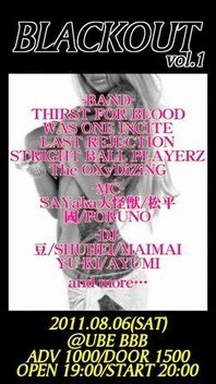 2011.08.06 "BLACKOUT"vol.1 at UBE BBB OPEN 19:00 / START 20:00〜 ADV \1,000 / DAY \1,500 -BAND- THIRST FOR BLOOD WAS ONE INCITE LAST REJECTION STRIGHT BALL PLAYERZ The OXyDiZiNG -MC- SAYaka大怪獣 松平 國 PORUNO -DJ- 豆 SHUHEI MAIMAI YU-KI AYUMI and more… 宜しくお願いします!