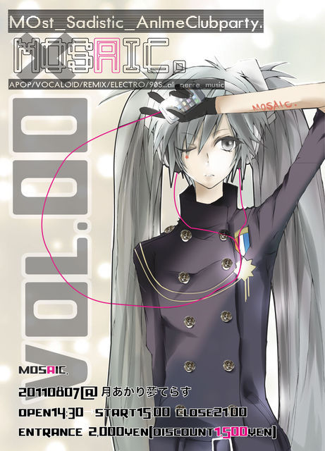 ……MOSAIC.0807.…………… アニソンを基調にボカロ、リミックス、エレクトロ、 電波、JPOPを融合させたDJ&VJパーティー☆★☆ 休日だからって、休まない!真昼間から飲んで踊って 滾って週末を締めくくる! 今までコラボしたことのない、 独断と偏見で集められたDJたちが想い想いに月あかり 夢てらすを染め上げる! そのケミストリーは想定外・・・?! 居合わせないと、体感することのできないMOSAICの 向こう側に、いざ…………………××× コンセプト「 こ ん な の は じ め て 」 そんな感情をゲストに持っ