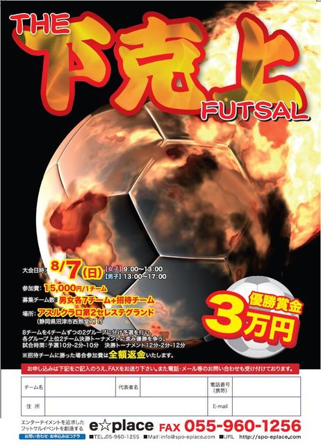 激アツな大会が誕生!! 優勝賞金3万円! 更に招待チームに勝ったら 参加費全額返金!! 日時:2011年8月7日(日) 女子9:00〜13:00 男子13:00〜17:00 会場:>アスルクラロ第2セレステグラウンド(沼津) 募集チーム数:男女ともに7チーム+招待チーム1チーム 招待チーム女子の部【golrira shizuoka様】 ※男子の部は確定次第広報いたします。 大会概要:8チームを4チームずつの2グループに分け予選を行い、 各グループ上位2チームにより