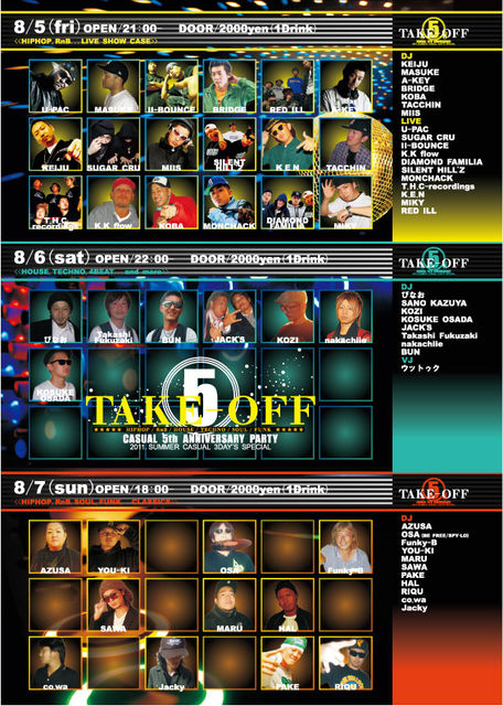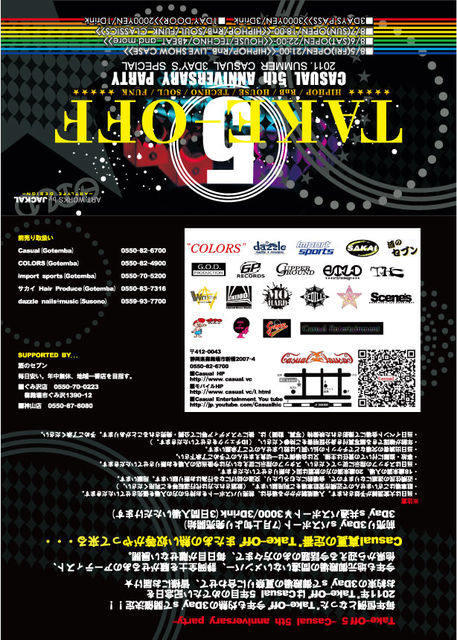Take-off5 〜Casual 5th anniversary party〜 毎年恒例となった「Take-off」今年も灼熱の3Day'sで開催決定!! 2011年「Take-off」はCasual5年目のめでたい記念日を お約束の3Day'sで御殿場の夏祭りに合わせて、皆様にお届け☆ 今年も地元御殿場の間違いないメンバー、静岡全土を騒がせるあのアーティスト、 他県から迎える今話題のあの方々まで、毎日目が離せない展開。 Casual真夏の定番「Take-off」またあの熱い奴等がやって来る・・・ 前売り3Daysパスポート ¥3000/3Drink