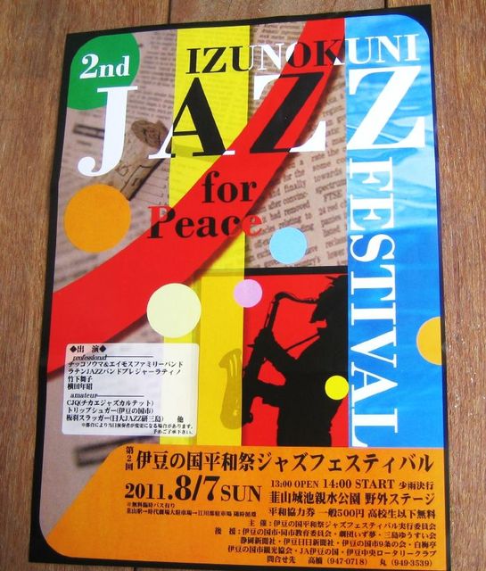 昨年盛況だったジャズフェス、今年も会場を変えてやります! 平和への願いからはじまったジャズフェスティバルです。 ジャズを楽しみながら「平和で音楽の流れるまち伊豆の国」のイメージを発信し、街づくり運動に協力することが目的です。 出演 プレジャーラティーノ・チッコソウマ&エイモスファミリーバンド・(CJQ)チカエジャズカルテット・板羽スラッガー・トリップシュガー・その他 平和協力券 500円(高校生以下無料) ビール、ワインの出店あります。 主催 伊豆の国平和祭ジャズフェスティバル実行委員会 後援・協賛