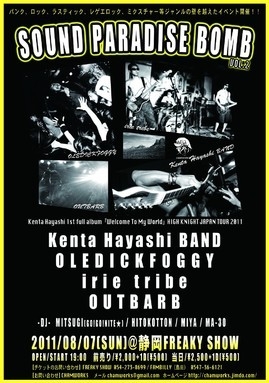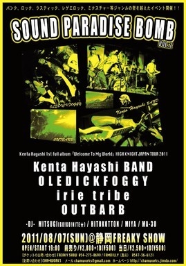 告知失礼します。 【SOUND PARADISE BOMB vol.2】 2011/08/07(sun) @静岡FREAKY SHOW open/start 19:00 前売り/\2,000+1D(\500) 当日/\2,500+1D(\500) [BAND] ◇Kenta Hayashi BAND(Four Minutes Til Midnight) http://www.myspace.com/kentahayashi ◇OLEDICKFOGGY http://web.mac.com/oledickfoggy/OLEDICKFOGGY/T.O.P.html ◇irie tribe http://www.myspace.com/irietribe5446 ◇OUTBARB [DJ] ◇MITSUGI (GO!GO!NITE☆) ◇HITOKOTTON ◇MIYA ◇MA-30 [チケットのお問い合わせ] ◇FREA