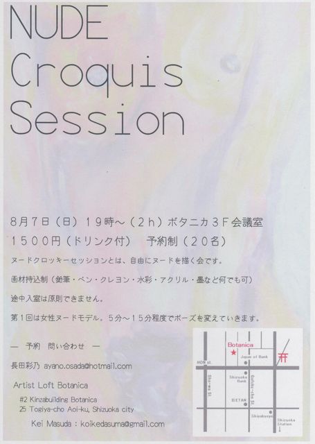 管理人さん告知失礼します。 静岡でヌードクロッキー会を発足しました。 第1回は、8月7日(日)19時より 参加費1500円 先着20名です。 詳細はこちらをごらんください。 http://blog.livedoor.jp/ayano0921/archives/51732789.html 誰でも、自由にヌードを描けるをコンセプトに 絵描きさんだけでなく、他の分野の人も、 自由にとらわれずに描ける会です。 それぞれが、個々にヌードを向き合ってもらえたらと思います。 予約制になっております。 申し込み・問い合わせ ayano.osada@hotmail.com 又はミクシーメッ