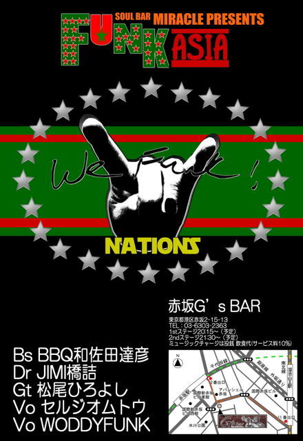 赤坂ミラクル提供FUNKASIA-Naked- 2011 日時 8月8日(月) 場所 赤坂G’s BAR 東京都港区赤坂2-15-13 TEL:03-6303-2363 http://www.g-s-bar.com 1stステージ20:15〜(予定) 2ndステージ21:30〜(予定) ミュージックチャージは投銭 飲食代(サービス料10%) SOUL BAR MIRACLE PRESENTS FUNKASIA Bs BBQ和佐田達彦 Drums JIMI橋詰 Gt 松尾ひろよし Vo セルジオムトウ Vo WODDYFUNK