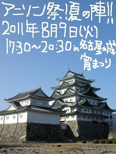 アニソン祭!夏の陣!! in 名古屋城宵まつり 開催日 : 2011年8月9日(火) 会場 : 名古屋城内二ノ丸東庭園(名古屋城東口よりすぐ) 時間 : 17:30〜20:30(入場 17:00 閉門 21:30) 料金 : 名古屋城宵まつり入場料のみ! ◆大人/当日800円,前売700円 ◆小・中学生/当日200円,前売100円 ◆福祉券/200円 ※前売券は、 サークルK・サンクス・セブンイレブン他 チケットぴあ(Pコード 987-320) ローソン・ローソンチケット(Lコード 42777) よりお買い求めください。 DJs : アニソン祭!オールスターズ 主催 : 名古屋城宵まつり実
