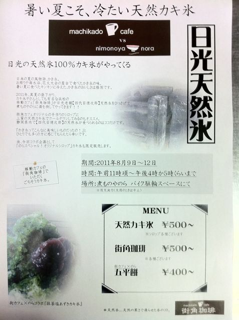 コミュ開設以来、初のイベント告知でーす。 のら開店以来17年間・今まで一度もイベント出店とか 他店とのコラボもしたことなかったのに〜、 ここにきて初の試み http://www.geocities.jp/nimonoyanora/news.html 8月9日(火)〜12日(金)のら駐車場バイクスペースで 午前11時から午後4時か5時くらいまでまちカフェさん営業予定 13日(土)14日(日)は、 まちカフェマスター、たけさんの気分次第で開催予定ナリ 移動カフェ・街角珈琲 (通称まちカフェ) http://ameblo.jp/machikadocafe/ テレビ、ラジオ