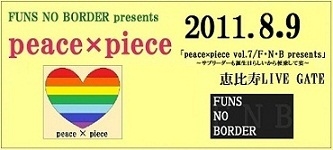 FNB企画ライブ!!!! ■8月9日(火)恵比寿LIVE GATE■ 「peace×piece vol.6/F・N・B presents」 〜サブリーダーも誕生日らしいから便乗して宴〜 FUNS NO BORDER主催 チケット料金: 前売/通常\2.000/当日\2.500 *-*-*-*-*-* ☆F.N.B企画特典価格☆ F.N.Bで予約された方は 《1.500円》 + 特典として2nd New SINGLEが付いてきます。 ※2nd New SINGLEをもう購入して下さってる方は、当日メンバーに言って下され ば次回のLIVEチケットを無料で差し上げます☆ *-*-*-*-*-* ・OPEN 18:00 ・START 18: