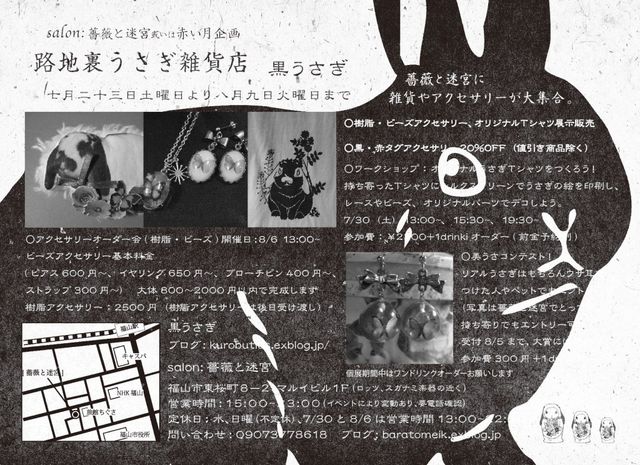 告知失礼致します。 れいこう堂の片隅にアクセサリーを置かせていただいている 黒うさぎの第2回目の個展を開催します。 『路地裏うさぎ雑貨店』 開催日:7/23(土)〜8/9(火) 開催場所:salon:薔薇と迷宮 広島県福山市東桜町8-2マルイビル1F 赤い月企画 新作のアクセサリーや雑貨、オリジナルTシャツなど大集合です。 ○ワークショップ:オリジナルうさぎTシャツをつくろう!(7/30 13:00〜) ○アクセサリー(樹脂・ビーズ)オーダー会(開催日:8/6 13:00〜�) ビーズアクセサリー:
