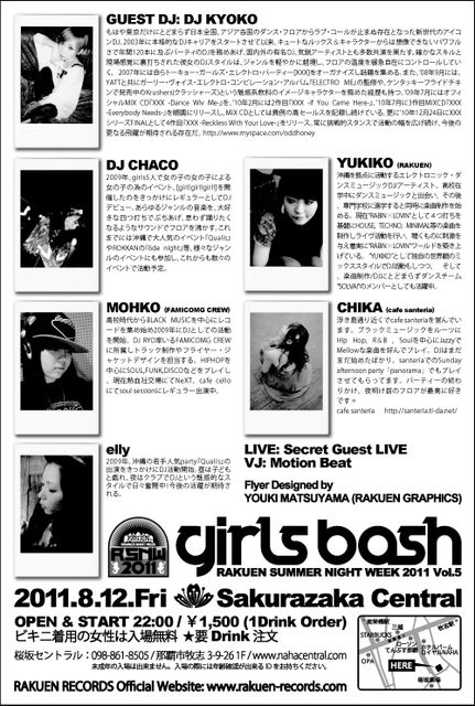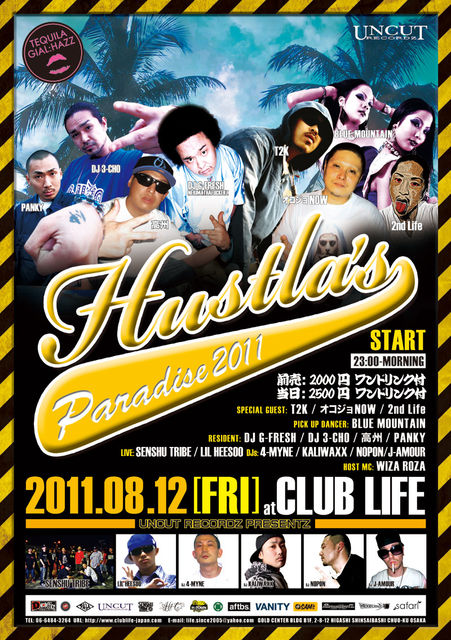 2011年 8月12日 金曜日@CLUB LIFE 大阪市中央区東心斎橋2-8-12 ゴールドセンタービルB1F TEL:06-6484-3264 OPEN 23:00-morning ADV 2000円w1d / ADM 2500円w1d Guest Live T2K オコジョNOW 2ND LIFE PICK UP DANCER BLUE MOUNTAIN RESIDENT DJ G-FRESH DJ 3-CHO 高州 PANKY LIVE SENSHU TRIBE LIL HEESOO DJs 4-MYNE KALIWAXX NOPON J-AMOUR
