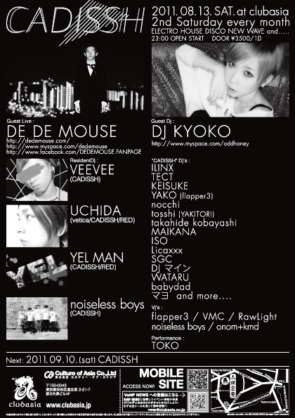 8月のCADISSHはゲストライブにDE DE MOUSE、ゲストDJにDJ KYOKO、このお二方を迎えての開催です!
