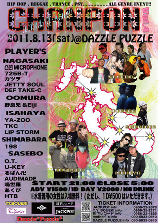 管理人様、告知失礼いたします 真夏の暑い日に あのEVENTが帰ってきた!! 今回は、水着partyをかねての盛大EVENT!! それは、こちら! HIPHOP.REGGAE.PSY...ETC 【CHANPON】 8/13(Sat)@DAZZLE PUZZLE 前売り(ADV)/\1500(1DRINK) 当日(DAY)/\2000(1DRINK ORDER) START/20:00〜 【BIKINI TOPの女性入場FREE!!】 【※1DRINK \500は頂きます】 〜PLAYERS〜 【NAGASAKI AREA】 MC 凸凹MICROPHONE(ARTICAL) DJ 725B-T(ARTICAL) MC カツヲ(N.J.C) DANCER JETTY SOUL DANCER DEF TAKE-C 【OOMURA AREA】 MC野良児&EIJ