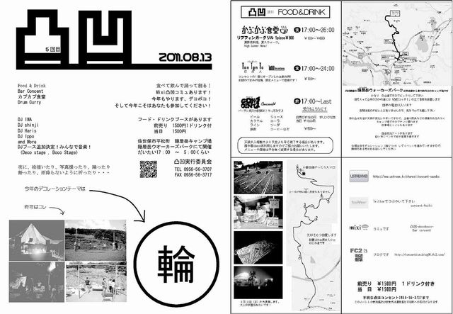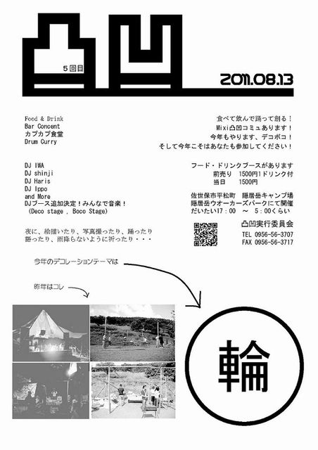 今年もやってきました!! 佐世保の夏フェス!! 佐世保の夏フェスといえば、「凸凹」!! 今年も新しい事やりますよ! 時間ある人は、ふらっと隠居岳までのぞきにきてね! 大人の学園祭、は〜じま〜るよ〜!!! ********************************************************* 凸凹「輪-rin-」 2011/08/13(sat)〜14(sun) @隠居岳ウォーカーズパーク 17:00start〜sunrise Fee(当日) \1,500 Add(前売)\1,500(with 1drink) DJ Shinji Haris iwa ippo ...and more SYSTEM xiongm