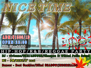 管理人様貴重なスペース失礼いたします。 NICE TIME@Eggman Day:8/15(mon) Open:23:00 ADM \1500/1d #ID Check 18!! 18歳未満及び高校生のご入場は不可能です。また、IDチェックを行なっています ので、実年齢にかかわらずIDをお持ちでない方のご入場も出来ません。 MC 小僧 MC RENE MC B'nest DJ vivienne DJ OKU DJ ANSWER Chanpon fr Wicked Pedia sound Dancer Beat Gambler Blind SHADOW (iNDERELLA:)