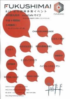 8.15に福島で行われるイベント 『FUKUSHIMA!』の世界同時多発イベントを香川県丸亀市でも開催します☆ 当日、丸亀会場ではライブの模様をネット配信する予定です。 http://www.ustream.tv/channel/isyokuju 丸亀会場「musiCafe MYGOマイゴ」 午後4時開始 入場無料!! ※1ドリンクオーダー制 出演 16:00-16:20 custom radio ---転換10分--- 16:30-16:50 狩野幸子 ---転換10分--- 17:00-17:20 SPIRAL CALM ---転換10分--- 17:30-17:50 ヒミツノDDT ---転換10分--- 18:00-18:20 CHAOS&LANGUAGE ---転換10