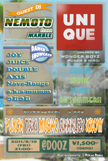 [UNIQUE]@DOOZ 8/19 fri OPEN 21:00〜 door \1500 with 1drink FUNKY MUSIC PARTY on SUMMER!! ≪GUEST DJ≫ NEMOTO from MARBLE ≪Dance Showcase≫ JOY JUICE DOUBLE AXIS Nove-Rouge a.k.a-mumm つむつむ ≪UNIQUE's DJ≫ PUNCH TAKI MUSHO AHHHLEY KROW organize by WONDER BOYZ[PUNCH & HIRO] flyer designed by KIKYO KOBO 8月のUNIQUEはSUMMER SPECIAL! GUEST DJにはスキルフルなPLAYで郡山を中心に県内外で活躍するテックディスコDJ、DJ NEMOTO Dance Showcaseには郡山からJOYをはじめ、仙台からも3チームを招聘。 また、期待の