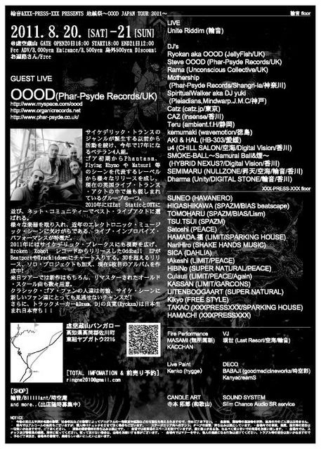 輪音&XXX-PRESS-XXX PRESENTS 地鎮祭〜OOOD JAPAN TOUR 2011〜 2011.8.20.[SAT]-21[SUN] @虚空蔵山 GATE OPEN20日16:00 START18:00 END21日12:00 Fee ADV/3,000yen Entrance/3,500yen 島外500yen Discount お遍路さん/Free *GUEST LIVE OOOD(Phar-Psyde Records/UK) *輪音 floor LIVE Unite Riddim (輪音) DJ's Ryokan aka OOOD (JellyFish/UK) Steve OOOD (Phar-Psyde Records/UK) Rama (Unconscious Collective/UK) Mothership (Phar-Psyde Records/Shangri-la/神奈川) SpiritualWalker aka