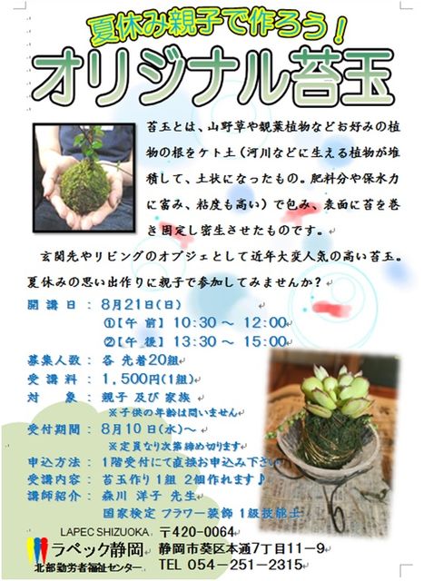 管理人様トピ立て失礼します。 不適切でしたら削除お願い致します。 講座の宣伝させてください。 静岡市葵区本通りにある「ラペック静岡」にて 夏休み企画として 近年、リビングや原玄関のオブジェとして人気の高い ★「親子で作ろう!オリジナル苔玉」★の 講座を下記のとおり開講予定です。 興味がある方のご参加お待ちしております♪ 【日 程】 8月21日(日) ? 午前の部 10:30 〜 12:00 ? 午後の部 13:30 〜 15:00 【受講料】 1組 1,500円(2個作成します) 【募集人数】 午前・午後とも