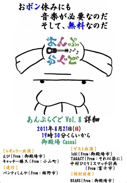 おボン休みにも 音楽が必要なのだ 生音、生声の20分勝負!「あんぷらぐどVol.8」 公演名:「あんぷらぐどVol.8」 日にち:8月21日(日) 時間:19:30〜22:00くらいまで 場所:御殿場Casual (静岡県御殿場市新橋2007-4 0550-82-6700 御殿場駅富士山口から徒歩5分) チケット:入場無料 【生音演奏者8.21】 ※50音順 《レギュラー演奏者》 ・えぴ(From:御殿場市) ・キャッチー勝又(From:小山町) 《特別前座》 ・BEANS(From:御殿場市) 《ゲスト演奏者》 ・ichi(From:御殿場市) ・TAQACY