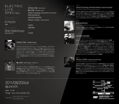 管理人様、告知失礼します。 静岡県内のサウンド・クリエイター達が集結!! 素晴らしい音源を出していながら、静岡でライブを披露する機会って少ないですよね。なかなか同じステージで出演することがないライブ・アーティストが、この日JAKATAに集結!最新のエレクトリック・ライブを存分にお楽しみください!! ゲストライブには、ただ今全世界で大注目のA.Mochiが登場します。 そしてレーベル・オーナーでもあり、DJとしては国内最大級のテクノイベント「WIRE」にも参加が決定してる Shin Nishimuraが久しぶりの来静。 この贅沢な一夜