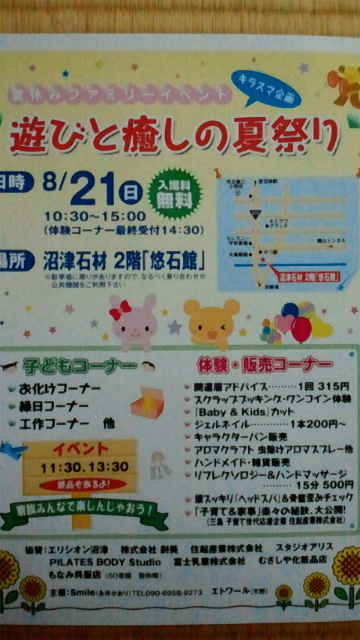 こんにちは 貴重なスペースをお借りいたします 皆で楽しんでもらえるようなイベントがしたいexclamation 家族みんなの笑顔が見たいexclamation ×2 と言う事で、企画致しましたわーい(嬉しい顔) 夏休みファミリーイベント 「遊びと癒しの夏祭り」 〜家族みんなが楽しいひと時〜 クローバー日時:8月21日(日)10:30〜15:00(体験ブース最終受付14:30) クローバー場所:沼津石材2階 「悠石館」 沼津市下香貫前原1477−1 ※駐車場に限りがありますので、乗り合いか公共機関をお使い頂けると嬉しいです 入場料無料 お土