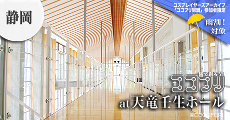 ■08/21『皆で創ろう!ココフリ at 天竜壬生ホール』 日付:2011年08月21日 (日) 名称:皆で創ろう!ココフリ at 天竜壬生ホール 場所:天竜壬生ホール    〒431-3314 浜松市天竜区二俣町二俣20-2    ■JR浜松駅より遠州鉄道で終点「西鹿島」駅下車、遠州鉄道バス「二俣・山東行き」で「秋野不矩美術館入口」下車、徒歩約10分 時間:11:00〜18:00 料金:コスプレイヤー参加料金::1,500円(税込)    一般・カメラマン参加料金:3,000円(税込) 条件:オールジャンルコスプレ、一般、カメラマンOK