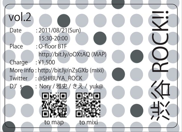 ※イベント開始時間を30分早めました! ※前回あまりにみんなが踊っていて暑かったので、途中で冷房をきかせるための休憩TIMEを設けました(笑)。また、好きな曲をかけられる時間を5分延ばしました。 ★8/21 渋谷ROCK!! Vol.2 club AKG(アジカンDJイベント)、MAMA NIGHT(BIG MAMA DJイベント)、J-POP NITE(J-POP DJイベント)のDJ同士で、新しく渋谷を活動拠点にするDJイベントを立ち上げました その名も、渋谷ROCK!! 第2回は、翌週のSweet Love Showerの出演者を気にしながらスピンします 2次会もやるので、みんなで音