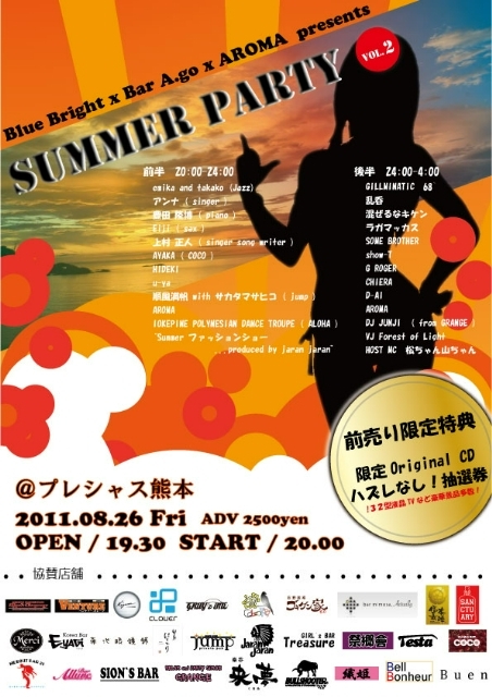 『Summer Party vol.2』 毎年夏に開催され、多くの集客を誇るあのSummer Partyが今年も決定!! 今回はファッションショーに加え県内外からも様々なアーティストを迎え熊本の夏の夜を豪華に盛り上げる。 EVENT内容もしっとりとした雰囲気とCLUB TIMEの二部構成なので幅広いお客様に楽しんでいただけるようになってます。 他、ご来場の皆様には多数BIGな特典も用意しておりますので、今年の夏を締めくくるSummer Partyになること間違いナシ!! Blue Bright、Bar Ago、AROMA 共々たくさんのご来場お待ちしております。 Blue Bright&Bar