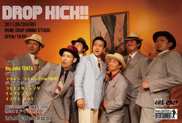 Big Jphn TENTAのファンの方ならお馴染みのイベント 『GIANT SWING』 昨年で10周年を迎えました♪ 年に1回のこのショー、もっと間近に楽しみたい!! そんな訳でジェイク氏とプランを立てて もっと気軽にお酒とお食事、それに音楽を楽しむ・・・・ ジャイアント・スウィングに対して 『ドロップ・キック』というタイトルで不定期ですが 当ワンドロップにて年4回位のペースで開催しま〜す♪ 今回はナ、ナント!東京からゲストエンターテイナー 『フウジン・ライジン』が参戦!! キウイのゼスプリのCM『キウイの王子