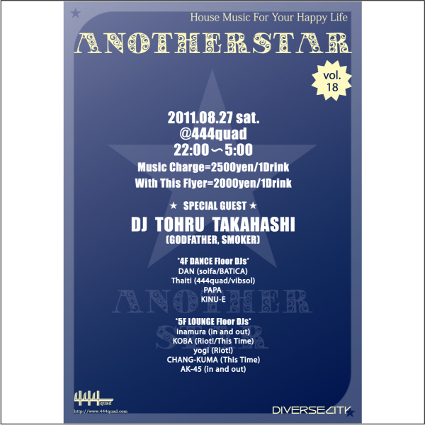 管理人様、告知失礼します。 (ANOTHER STAR) 偶数月、第四土曜日開催中のANOTHER STAR。 HOUSE MUSIC=DANCE MUSICをテーマに、main floorでは毎回心地良いDANCE MUSICに酔いしれるお客さんが溢れています。 そしてlounge floorでは、テクニカルなDJ陣が、これぞlounge musicといえる音源の数々で、素敵な時間を演出します。 なんといってもANOTHER STARには笑顔が溢れています。 今回のGUEST DJには、ANOTHER STAR開始当初より、一度はお呼びしたいと考えていた方に、お越しいただくこととなりました。 そのお方とは、DISCO世代から、現在