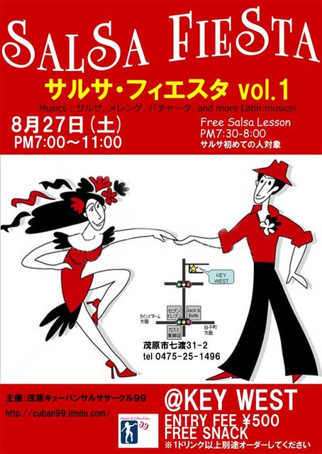 イベント告知させていただきます。 茂原市内でサルサダンスイベントを開催します。 年齢・性別・経験問わず楽しめるラテン音楽とダンスのイベントです。 初心者向けレッスンもありますので初めてでも大丈夫 ぜひ気軽に遊びに来て下さい。 暑い夏の夜に皆で熱く盛り上がりましょう サルサ・フィエスタ Vol.1 日時:8月27日(土) PM7:00〜PM11:00 場所:KEY WEST(キーウエスト) 茂原市七渡31-2 TEL: 0475-25-1496 入場料:500円(軽食込み) ※別途1ドリンク以上のご注文