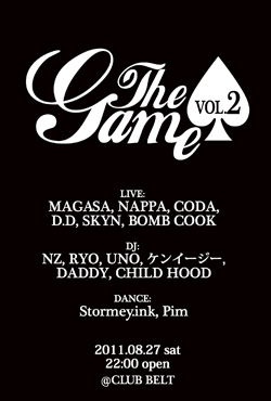 今週末8/27(土)‼ DJ NZによる新イベント[The Game] 今回2回目です! クラブ好きからHIPHOP好きまで年齢層も若手から玄人まで幅広く楽しめる空間作りを念頭に展開していきます‼ [The Game] *偶数月第四土曜日開催 22:00 OPEN [LIVE] MAGASA NAPPA CODA D.D SKYN BOMB COOK [DJ] NZ R.Y.O. UNO ケンイージー DADDY CHILD HOOD [Dance] Stormey.ink Pim メッセージ頂ければゲストお取りしますので、気軽にどうぞ! 皆様と一緒に楽しめたらと思います‼ よろしくお願いします!