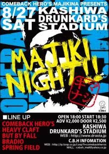 COMEBACK HERO'Sボーカルのマジキナが個人企画しやす 8月27日@南柏Drunkard's STADIUM ~MAJIKINA pre~ 【マジキナイト!!】 ●COMEBACK HERO'S ●HEAVY CLAFT ●BUT BY FALL ●BRADIO ●SPRING FIELD ete... OPEN/18:00 START18:30 ADV/\2000 DOOR/\2500 遊び来てねー