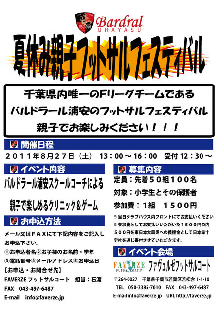 千葉県内唯一のFリーグ参戦チームである バルドラール浦安のイベントです。 是非ご参加ください!!! 尚、参加費としていただいく1500円のうち 500円は東日本大震災の被災地への 義援金とさせていただき 日本赤十字社を通じ寄付させていただきます。