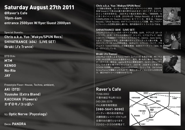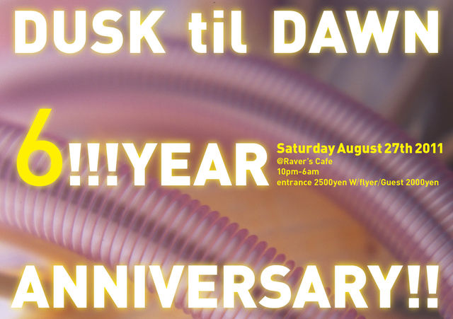 DUSK til DAWN 6!!!!YEAR ANNIVERSARY! Saturday August 27th 2011 -Raver`s Cafe 10pm-6am Psychedelic Trance/ Goa trance Entrance 2500yen W/flyer/Guest 2000yen ☆Special Guests: DJ-Chris a.k.a. Yuo [SPUN Recs/Wakyo] http://mixi.jp/view_community.pl?id=4552230 DJ @raki(J`z Trance) http://mixi.jp/view_community.pl?id=27218 DJ SHIVATRANCE(604) (LIVE SET) http://mixi.jp/view_community.pl?id=4342999 ☆DTD DJs: MTM(DTD) KENGO(DTD,Kaen) JAY(DTD) AK