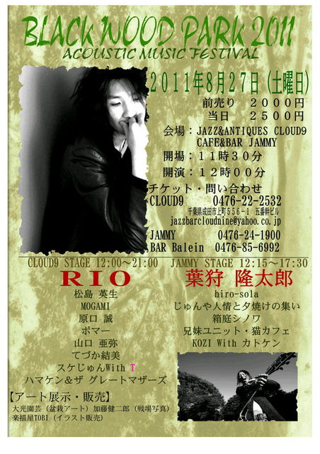 葉狩隆太郎が出演するイベントを告知させて戴きます! 成田最大級の夏フェス『BLACK WOOD PARK』開催! 今回は「ライブスペース」と「アートスペース」を展開し、音楽とアートを楽しめるイベントとなってます♪ ライブスペースは「CLOUD9ステージ」と「JAMMYステージ」の2箇所にて、アコースティックを中心とした実力派ミュージシャン全15組が集結! アートスペースは、戦場カメラマン「加藤健二郎」の写真展、楽描屋「TOBI」のイラスト展示&販売、「大光園芸」のアート盆栽の展示などをお楽しみ戴けます♪ 今回も盛りだく