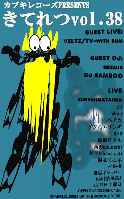 カブキレコーズ Presents"キテレツ"vol.38 @船橋 -音浴ギャラリーBAR『猿風呂』- 8月27日土曜日 OPEN 21:00 CLOSE 05:00 始発まで! CHARGE \1,000(1 DRINK) DRINK ALL \500- GUEST LIVE: VELTZ/TV-with bum(http://www.vlzprodukt.com/) GUEST DJ: nezmix DJ BAMBOO LIVE: kunyahmatahka (http://soundcloud.com/kabukirecords) DJ: chou ペチカ メタルエリンギ K-9 板橋ワタル 高田midnight 何?(chaos set) 國友くに子 No Genre But キテレツ *************** http://kiteletsu.exblog.jp/
