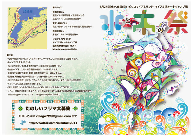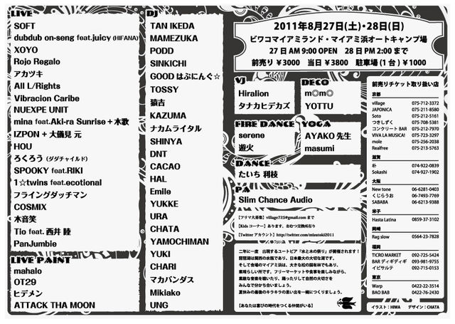 入場無料のチャリティーミュージックフェス開催決定!!! 【Save the Birthday 2011】 2011年8月27日(土) @滋賀県彦根市荒神山公園野外特設ステージ Cast ■韻シスト ■OUTER-TRIBE ■スパイク ■SKA FREAKS ■sylph emew ■nueva ■Come This Call ■bangMIXcube ■oversatoshi DJ:Save the Birthday Crew (FULLKAZ/BOSE/MAKOTO/WAKKY) 14:00 START フリーマーケット同時開催! (12:00〜18:00) 入場無料! (チャリティーイベントの為募金のみ) ※会場内にチャリティーブースを設置し、東日本大震災