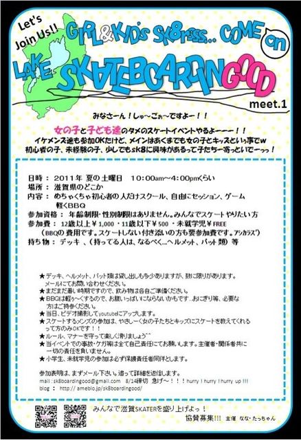 滋賀で最も熱いとされるガールズスケーター、hippo!!さんより企画頂きました LAKE SKATEBOARDINGOOD meet.1 日時 : 2011年 8月27日 10:00am〜4:00pmくらい 場所 : 五個荘中央公園 内容 : めちゃくちゃ初心者の人だけスクール、自由にセッション、ゲーム 参加資格 : 年齢制限・性別制限はありません。みんなでスケートやりたい方 参加費 : ¥FREE 持ち物 : デッキ 、(持ってる人は、なるべく...ヘルメット、パット類) 等 ★ デッキ、ヘルメット、パット類は貸し出しも多少ありますが、数に限