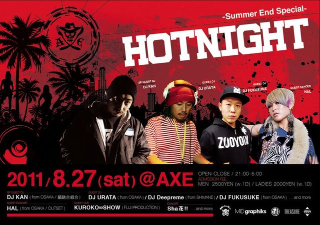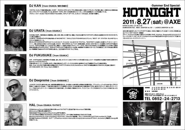 今年も暑いこの季節がやってきましたね AXEでは去年の夏にも大盛況だったイベントパーティーに続いて今年もイベントしまーす "HOTNIGHT" 山陰×大阪のコラボ企画R&B、ヒップホップ、レゲエのDJによるクラブミュージックをベースに、ダンサーによるshowcaseや地元出身のSingerによるライブと盛りだくさんねエンターテイメントパーティーです 豪華出演者はこちら SP GUEST DJ DJ KAN (from OSAKA/韻文合組合) GUEST DJ DJ URATA (fro