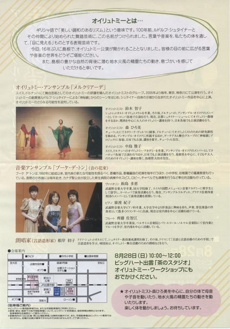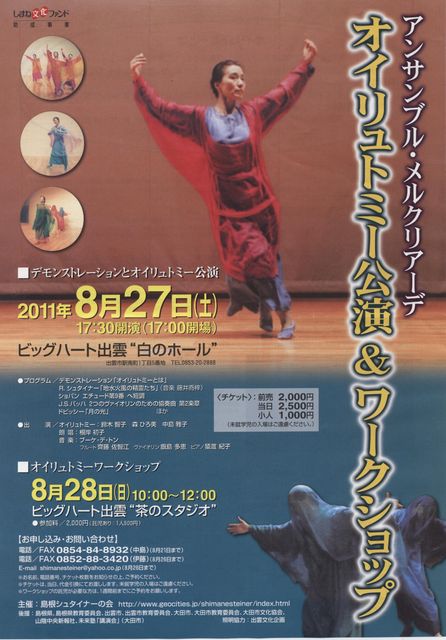 今回16年ぶりに島根で,オイリュトミー公演が開かれることとなりました。オイリュトミーアンサンブル「メリクリアーデ」をお呼びして,ビッグハート出雲でオイリュトミー公演&ワークショップを開催します。島根でオイリュトミーの活動をして下さっている,中島雅子氏も出演されます。 オイリュトミーとは,ギリシャ語で「美しい調和のあるリズム」という意味です。100年前,ルドルフ・シュタイナーとその仲間により始められた舞踏芸術に,この名前がつけられました。言葉や音楽を,私たちの体を通して,「目に見える」ものとする表現芸術です。